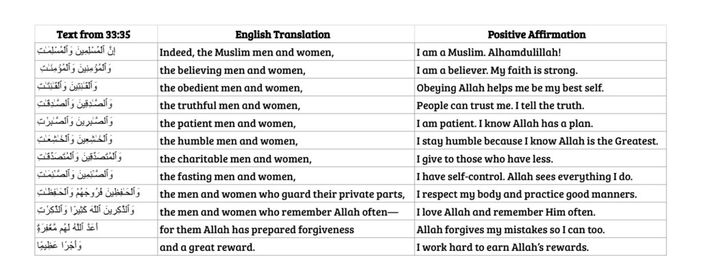 See the table below where I have broken down the ayah by attribute. In the third column, I created age-appropriate affirmations for kids to read aloud. I’ve started reading them with Nusayba and we’ve had some great discussions unpacking some of them.